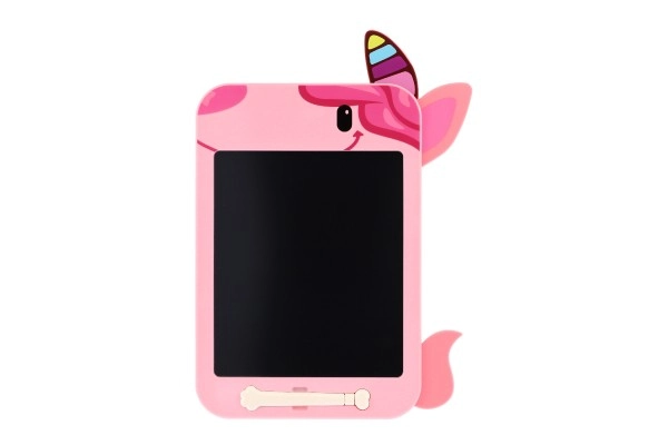 Tabletă LCD roz pentru desen cu unicorn 19,5 × 29 cm. Desenează, scrie și șterge printr-un singur buton. Ideală pentru copii de la 3 ani și adulți, pentru acasă și în călătorii.