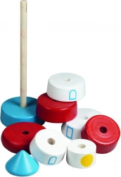 Stivuirea pe ax antrenează coordonarea ochi–mână, sortarea după formă și mărime și percepția culorilor. Prima jucărie didactică ideală pentru cei mai mici.
