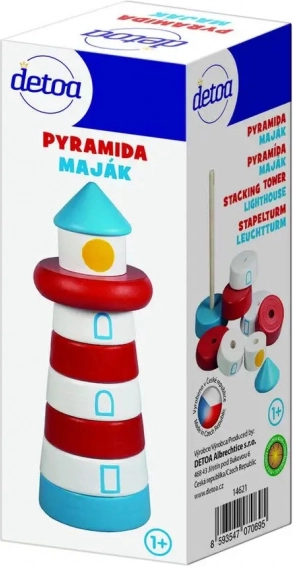 Farul din lemn, sub formă de piramidă de stivuire, îi invită pe copii să așeze piesele pe ax în funcție de formă și mărime. Jocul susține intuitiv coordonarea ochi–mână, răbdarea și percepția culorilor și formelor și, în același timp, stimulează plăcut simțul tactil datorită suprafeței netede.