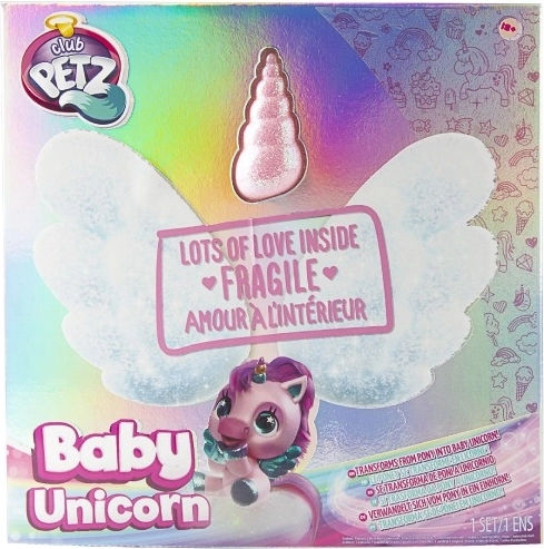 Pachetul include 9 accesorii tematice, cu care te vei distra pe săturate: biberon pentru hrănire, pieptene, aripi curcubeu, cleme, autocolante, pandantiv și certificat de adopție. Sunt disponibile 3 variante de culoare (alb, roz, albastru), astfel încât fiecare mic vrăjitor sau mică vrăjitoare își poate alege preferata.