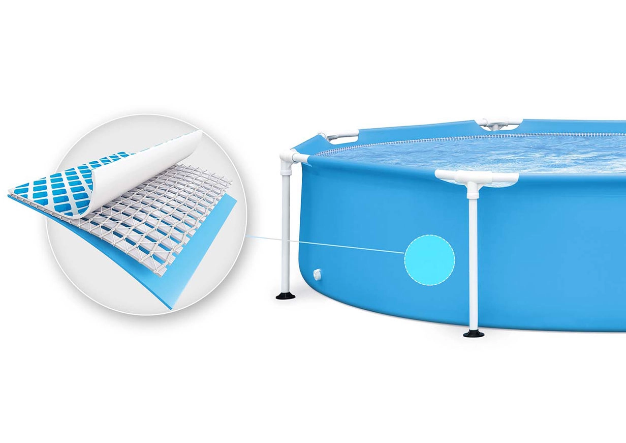 Armătura din plasă de nailon din mijlocul pereților asigură o durată de viață mare și rezistență la rupere și la intemperii. Valva practică de scurgere facilitează întreținerea, iar conectarea unei pompe de filtrare (nu este inclusă) ajută la menținerea apei curate.