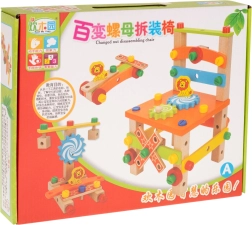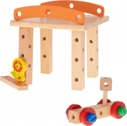 Acest set de calitate din lemn le permite copiilor să asambleze un scăunel de atelier și alte modele originale. Cu ajutorul șuruburilor, piulițelor și rotițelor dințate, copiii explorează principiile mecanicii simple, exersează concentrarea și îndemânarea. Scăunelul este stabil și, datorită sistemului gândit de găuri și îmbinări, oferă numeroase combinații.