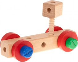 Include șurubelniță din lemn, cheie, șuruburi și piulițe – copiii învață să îmbine corect piesele și își dezvoltă motricitatea fină.