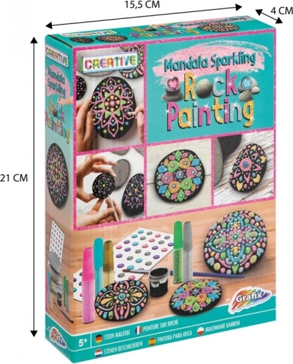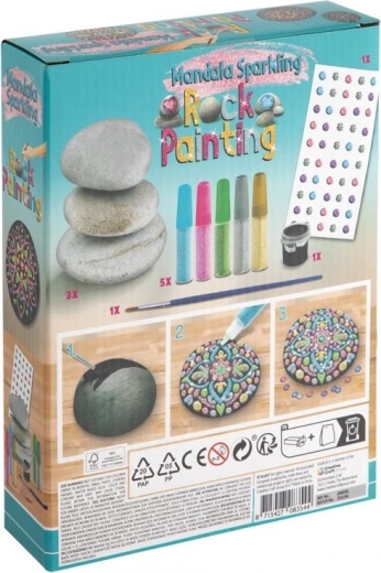 Cu acest set creativ, vei realiza cu ușurință modele de mandală spectaculoase și motive strălucitoare pe pietre netede. Datorită combinației de fundal negru, vopsele metalice și pietricele autocolante, decorațiunile tale vor ieși în evidență prin contrast și sclipire. Pictura pe pietricele este o modalitate excelentă de a te relaxa și, în același timp, de a crea cadouri frumoase sau accesorii pentru casă și grădină.