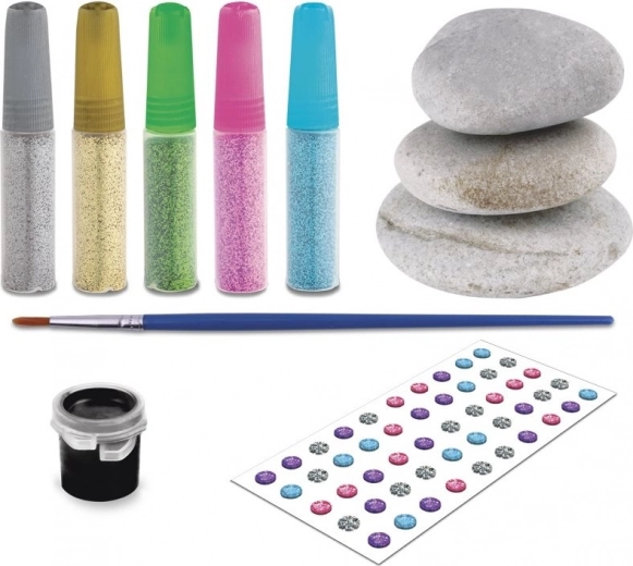 Trei pietre naturale netede, o pensulă, vopsea neagră, cinci nuanțe metalice și pietricele sclipitoare – începe să creezi imediat după deschidere.