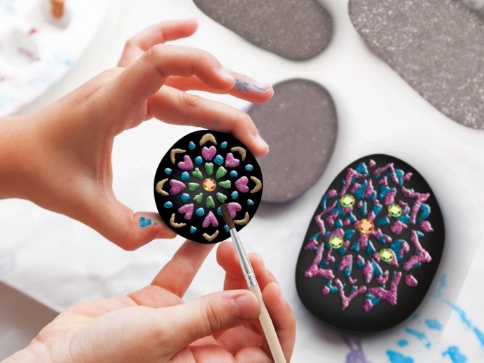 Conținutul setului este conceput pentru a fi potrivit atât pentru începători, cât și pentru micii artiști. Pietrele netede se țin bine în mână, pensula permite lucru precis, iar paleta metalică (albastru, roz, verde, argintiu și auriu) oferă fiecărui motiv un aspect elegant. Creativitatea nu are limite – de la mandale și fețișoare până la ornamente proprii.