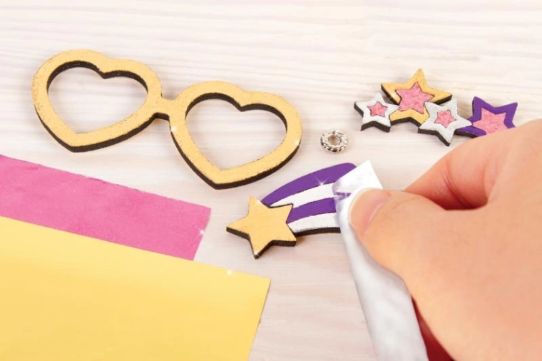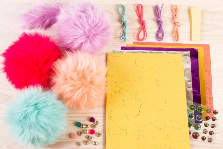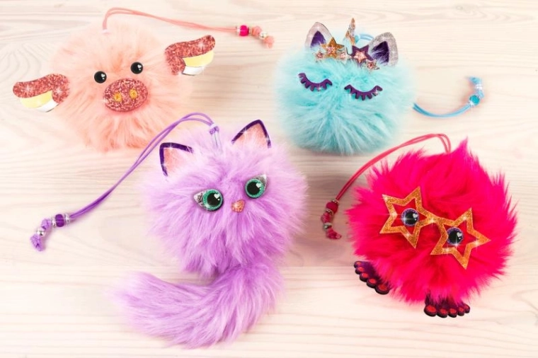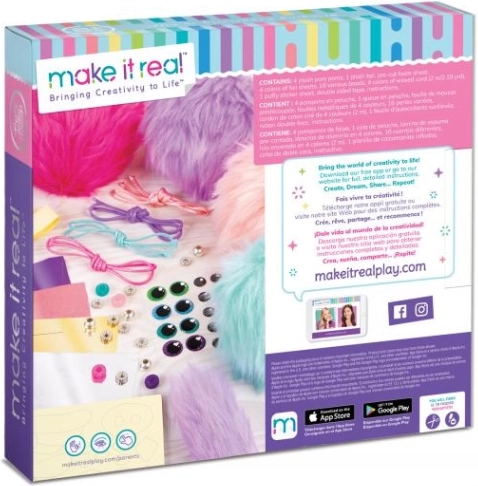 - Setul conține: 4 bile pufoase, o codiță pufoasă, accesorii din spumă, ochi, mărgele, 4 folii colorate, 4 culori de șnur cerat (2 m), bandă dublu-adezivă, instrucțiuni