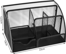 Acest organizator practic vă ajută să vă ordonați toate accesoriile de birou și să mențineți suprafața de lucru aerisită. Construcția robustă din metal (fier), cu design din plasă, este rezistentă și durabilă, astfel încât face față utilizării zilnice acasă și la serviciu. Datorită dimensiunilor compacte, încape pe orice birou, fiind totodată surprinzător de încăpător.