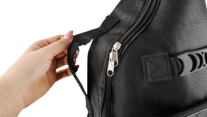 Două buzunare frontale: cel superior pentru mărunțișuri (penițe, capodastru, corzi) și cel inferior pentru partituri sau caiete în format A4.