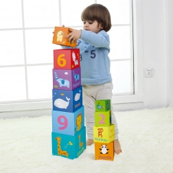 Aceste blocuri colorate conțin numere, animale și cuvinte în engleză, ajutând astfel la învățare și dezvoltarea abilităților cognitive.