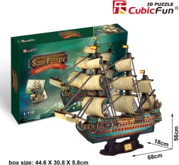 Puzzle-ul 3D velier San Felipe de la CubicFun oferă un model realist de galion istoric cu decorațiuni bogate și detalii bine gândite ale punții. Piesele din spumă de cca 3 mm, acoperite cu hârtie imprimată laminată, se îmbină cu precizie și permit un rezultat stabil și atrăgător fără utilizarea lipiciului sau a foarfecei.