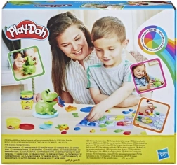 Setul de joacă cu broască aduce învățarea distractivă a culorilor și formelor, precum și dezvoltarea motricității fine. Copiii pot apăsa, presa și decupa forme, pot crea nuferi, fluturi și alte vietăți și în același timp își exersează natural coordonarea mână–ochi.