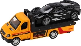 Această autospecială de tractare realistă, cu o mașinuță sport încărcată, completează parcul auto al copiilor cu un vehicul de lucru îndrăgit. Datorită mecanismului pull-back, este suficient să împingi, să eliberezi și să urmărești acțiunea – perfect pentru scenarii din oraș, de pe șosea sau din service.