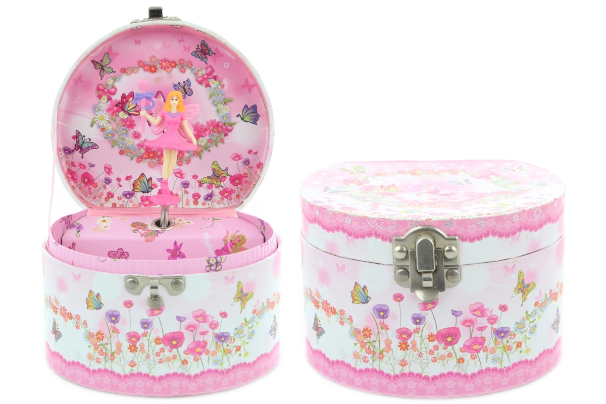 Încântătoarea cutie muzicală de bijuterii cu zână este accesoriul perfect pentru camera copilului. După o simplă întoarcere a cheiței, zâna din interiorul cutiei începe să se rotească și răsună o melodie delicată, creând o atmosferă de basm. Dimensiunea compactă se potrivește pe raft sau pe noptieră și oferă suficient spațiu pentru bijuterii mici sau comori secrete.