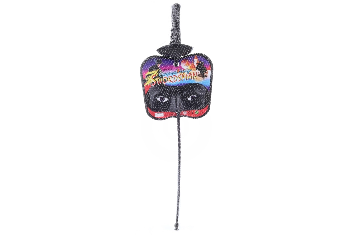 Spadă din plastic cu lungime de aproximativ 60 cm, cu mască din plastic pe elastic, cu lățime de aproximativ 17 cm. Ambalată într-o plasă. Dimensiunile ambalajului: aproximativ 60 x 18,5 x 7,5 cm. Vârsta: 3+