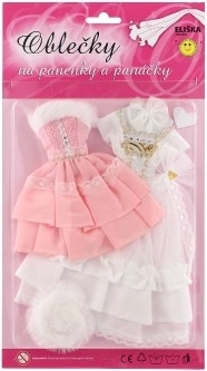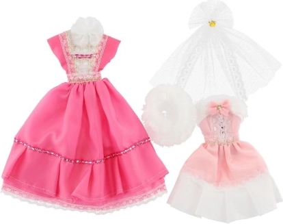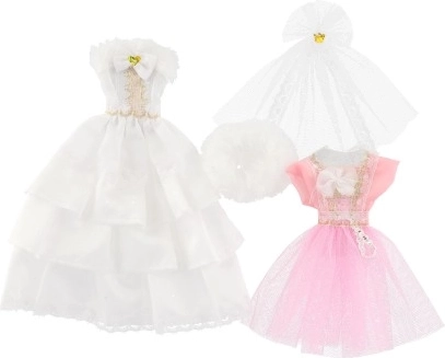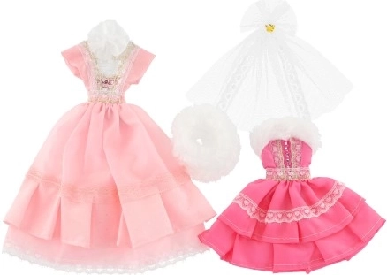 Două seturi diferite de rochii, fiecare având propriile detalii care adaugă fiecărei păpuși un aspect deosebit.