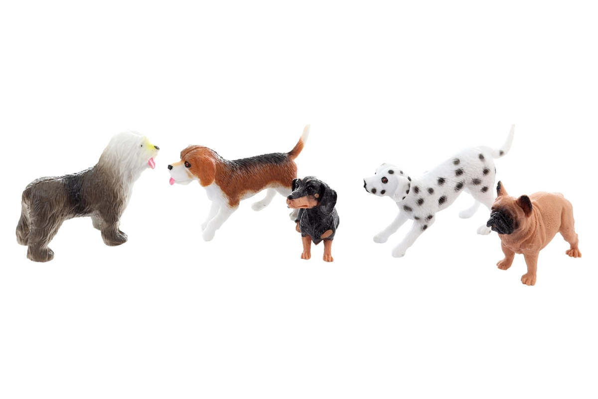 Fiecare cățel măsoară aproximativ 7 cm (în funcție de rasă) și este realizat din plastic rezistent, potrivit pentru joaca de zi cu zi. Pachetul cu dimensiuni de cca 15 × 18 × 4 cm conține cinci figurine diferite, astfel copiii își pot extinde colecția de animale și pot învăța să recunoască diferitele rase.