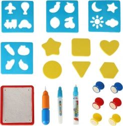 Pachetul include ștampile, șabloane, markere cu apă și pensulă. Copiii învață formele, culorile și își îmbunătățesc motricitatea fină.