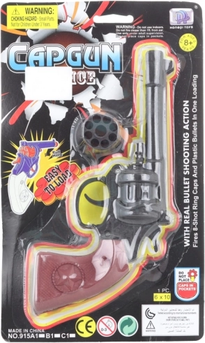 Bucură-te de distracție plină de acțiune cu acest pistol western cu capse cu încărcător pentru 8 focuri. Jucărie ușoară și sigură pentru copii, ideală pentru jocuri de aventură cu cowboy acasă și în aer liber.