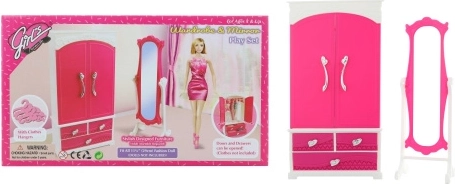 Dulapul GLORIE cu oglindă este un accesoriu grozav în lumea păpușilor. Oferă uși și sertare care se deschid pentru depozitarea rochițelor și accesoriilor și umerășe practice pentru a agăța ținutele preferate. Datorită oglinzii incluse, copiii pot combina ușor și încerca noi creații stilate.