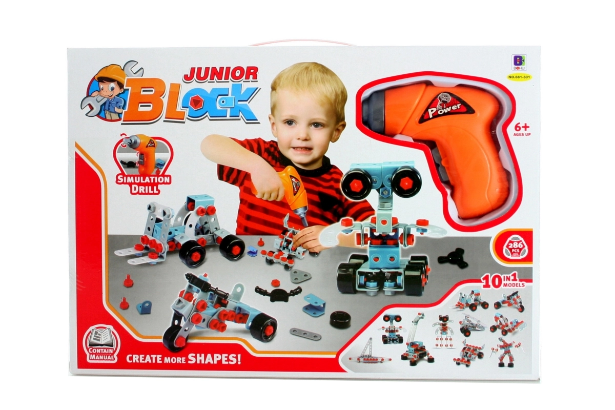 Setul de construcție Junior Block este alegerea ideală pentru micii constructori care adoră să înșurubeze și să descopere. Datorită setului bogat de 286 de piese din plastic rezistent, roți și conectori, copiii pot asambla diverse modele 10-în-1 – de la vehicule și roboți până la creații originale după propria imaginație.