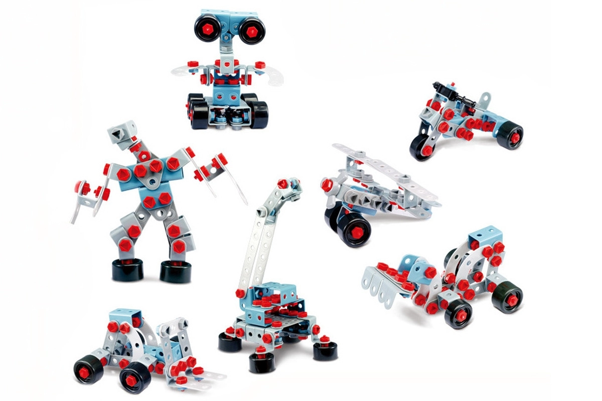 Grinzi modulare, conectori, roți și șuruburi care permit reconstrucții repetate. Ideal pentru dezvoltarea motricității fine și a gândirii tehnice.