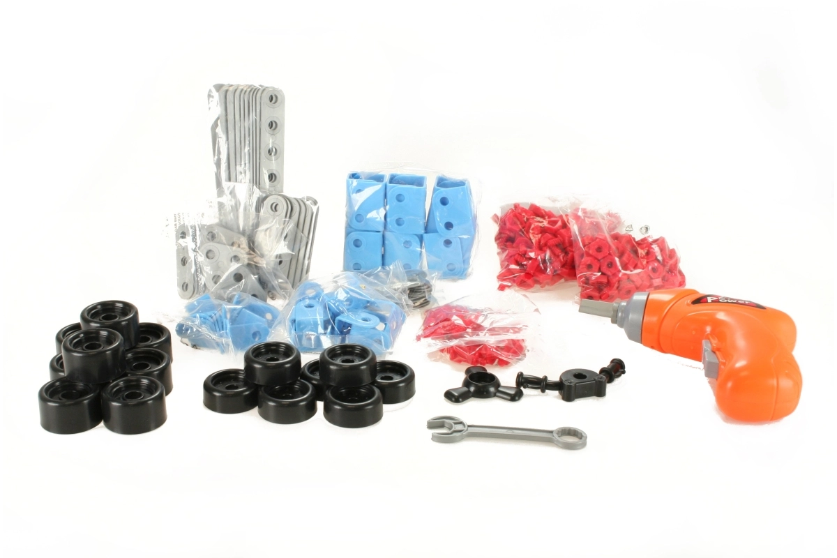 Include o bormașină pentru copii cu acumulator pe 2× baterii AA (nu sunt incluse), care imită unelte reale și învață priza corectă și coordonarea mâinii. Sistemul simplu de șuruburi și piulițe este sigur și adaptat mâinilor copiilor.