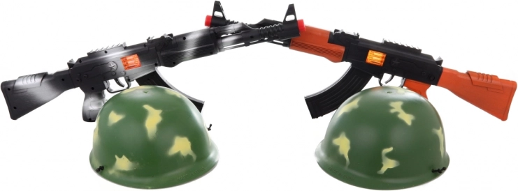 Set soldat pentru copii: pușcă cu zgomot de 53 cm și cască cu diametrul interior de 18,5 cm. Plastic ușor, distracție sigură pentru copii de la 3 ani.