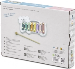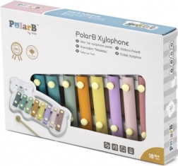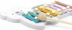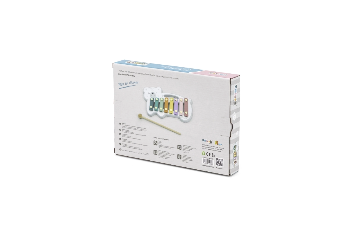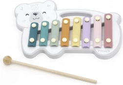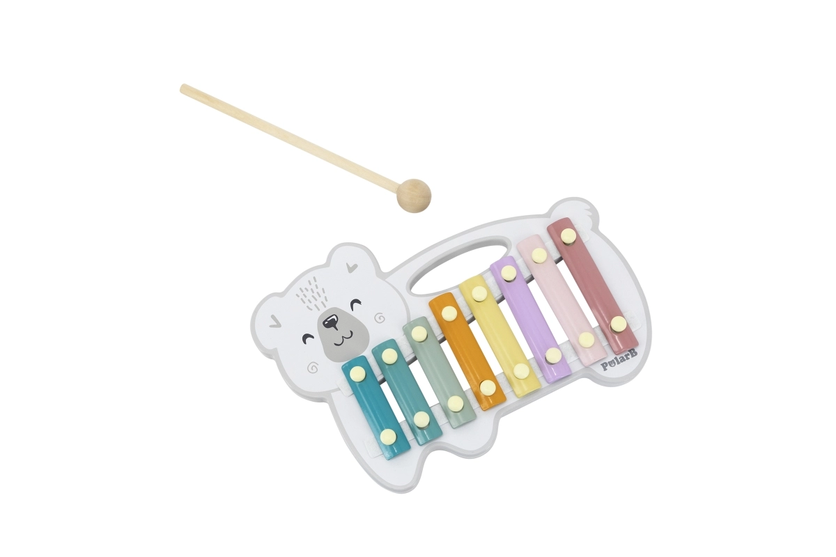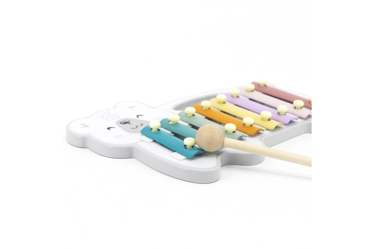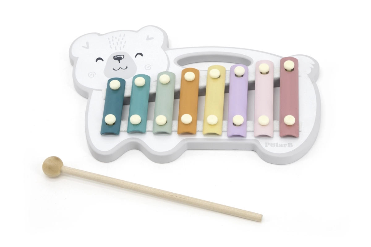 Xilofonul din lemn în forma unui urs polar îmbină estetica jucăușă cu un instrument muzical funcțional. Lamele metalice în culori pastel creează tonuri plăcute la lovirea cu bagheta din lemn, motivând copiii în mod natural să experimenteze cu sunete și ritm.