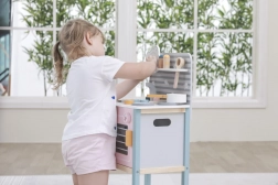Bucătăria este proiectată pentru un joc sigur al copiilor de la trei ani, încurajând dezvoltarea abilităților motorii fine și a artei de imitație.