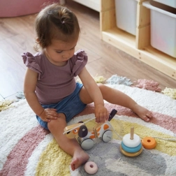 Jucăria dezvoltă coordonarea, creativitatea și imaginația și completează frumos colecția de jucării din lemn în culori delicate. Potrivită pentru joaca zilnică, acasă și în călătorii.