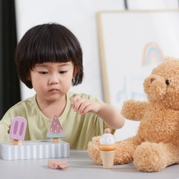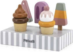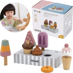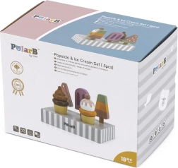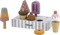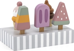 Setul de 5 înghețate din lemn în culori atrăgătoare aduce copiilor porții nesfârșite de distracție. Înghețatele sunt așezate pe un suport stabil din lemn, care servește pentru expunere și depozitare organizată. Totul este realizat din lemn de calitate și vopsit cu culori sigure, netoxice.