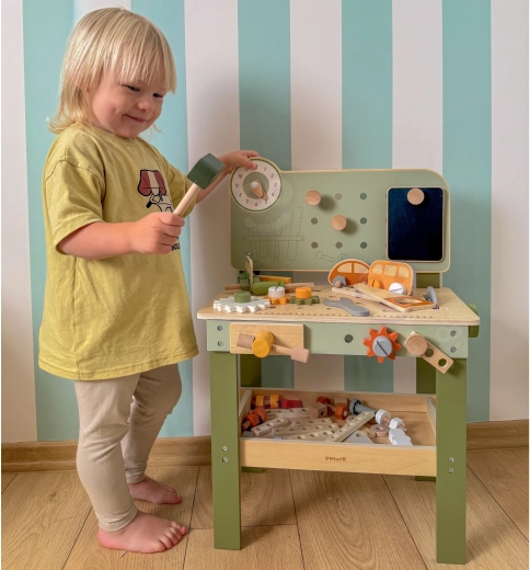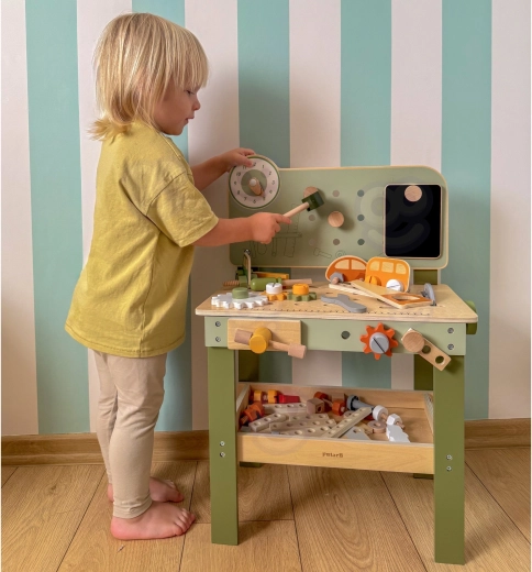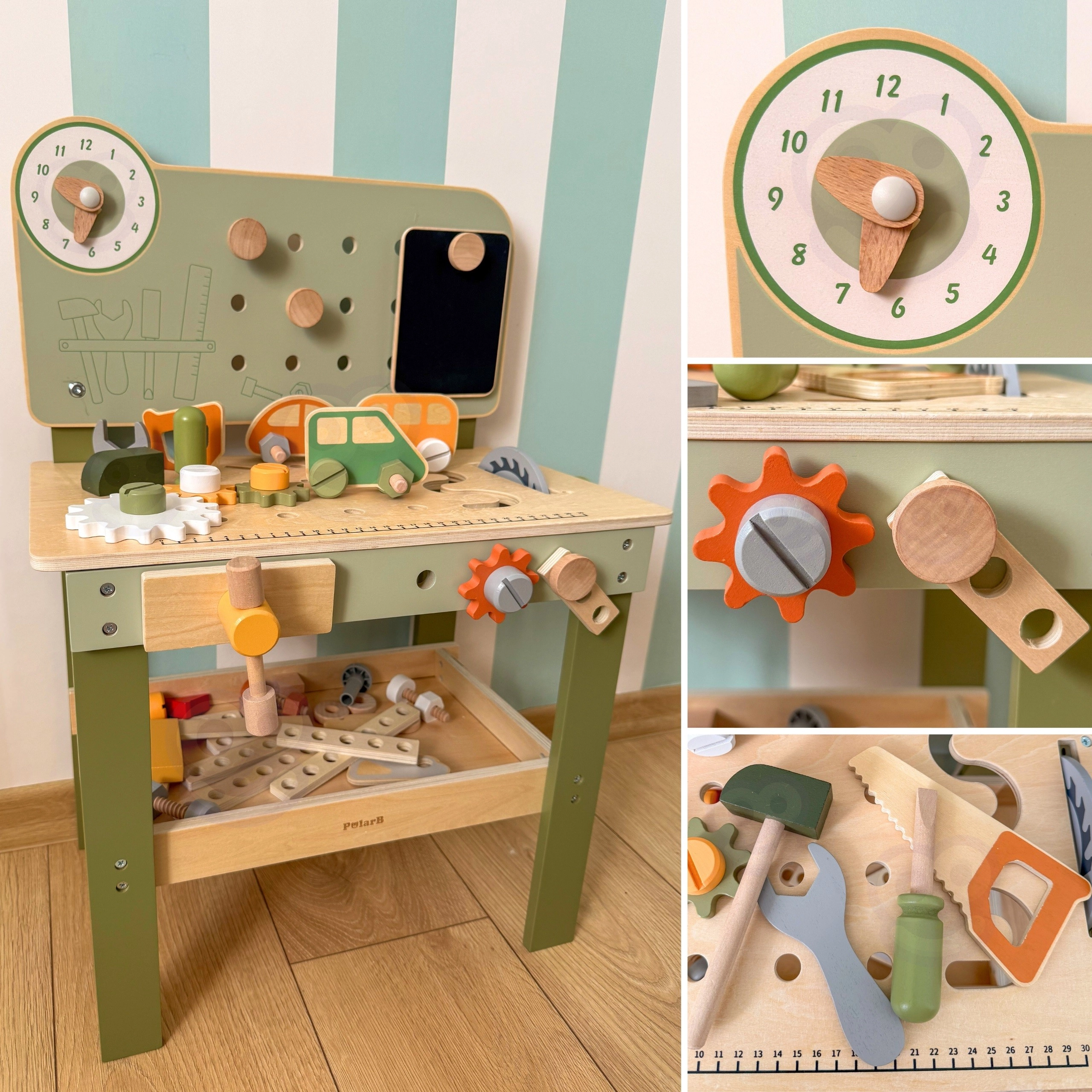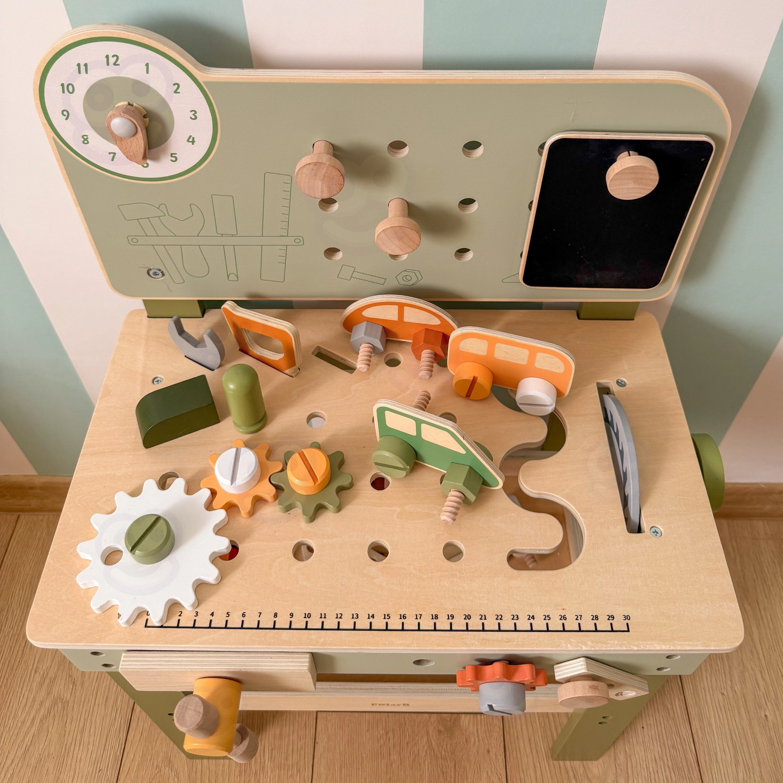 Banca cu pegboard, riglă gradată și elemente rotative susține jocul realist și dezvoltarea abilităților de lucru cu uneltele.