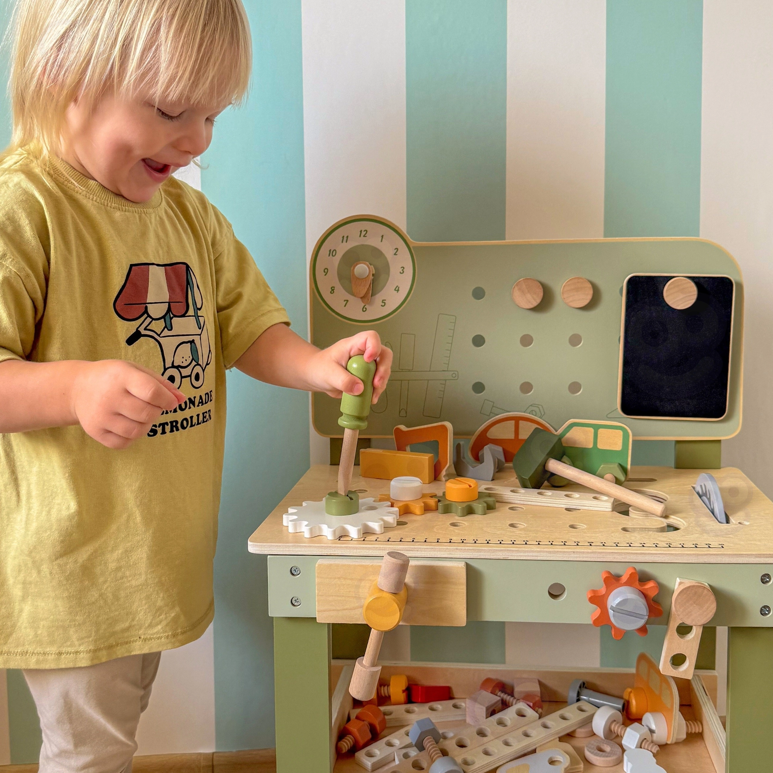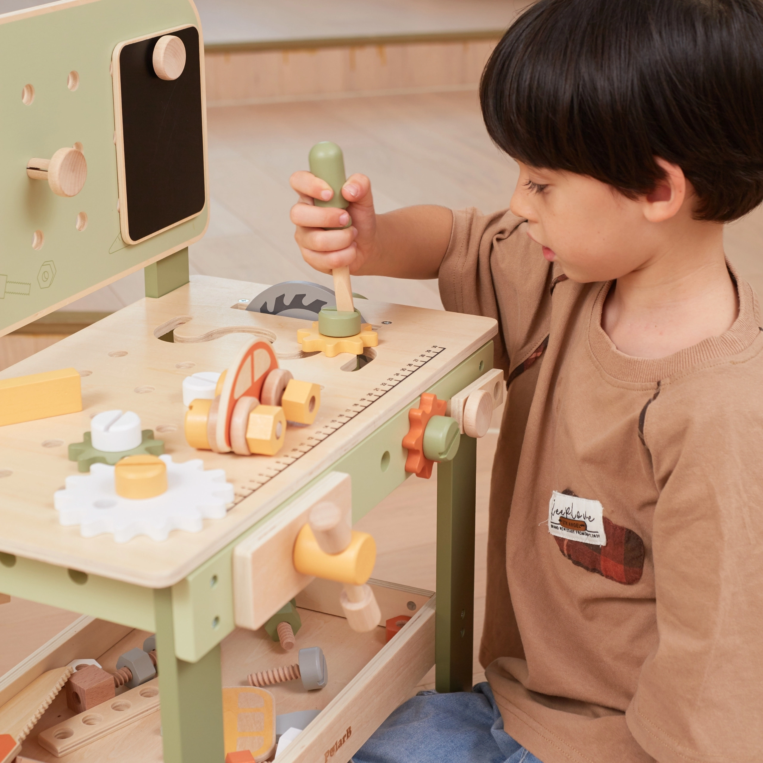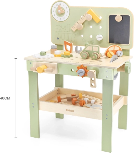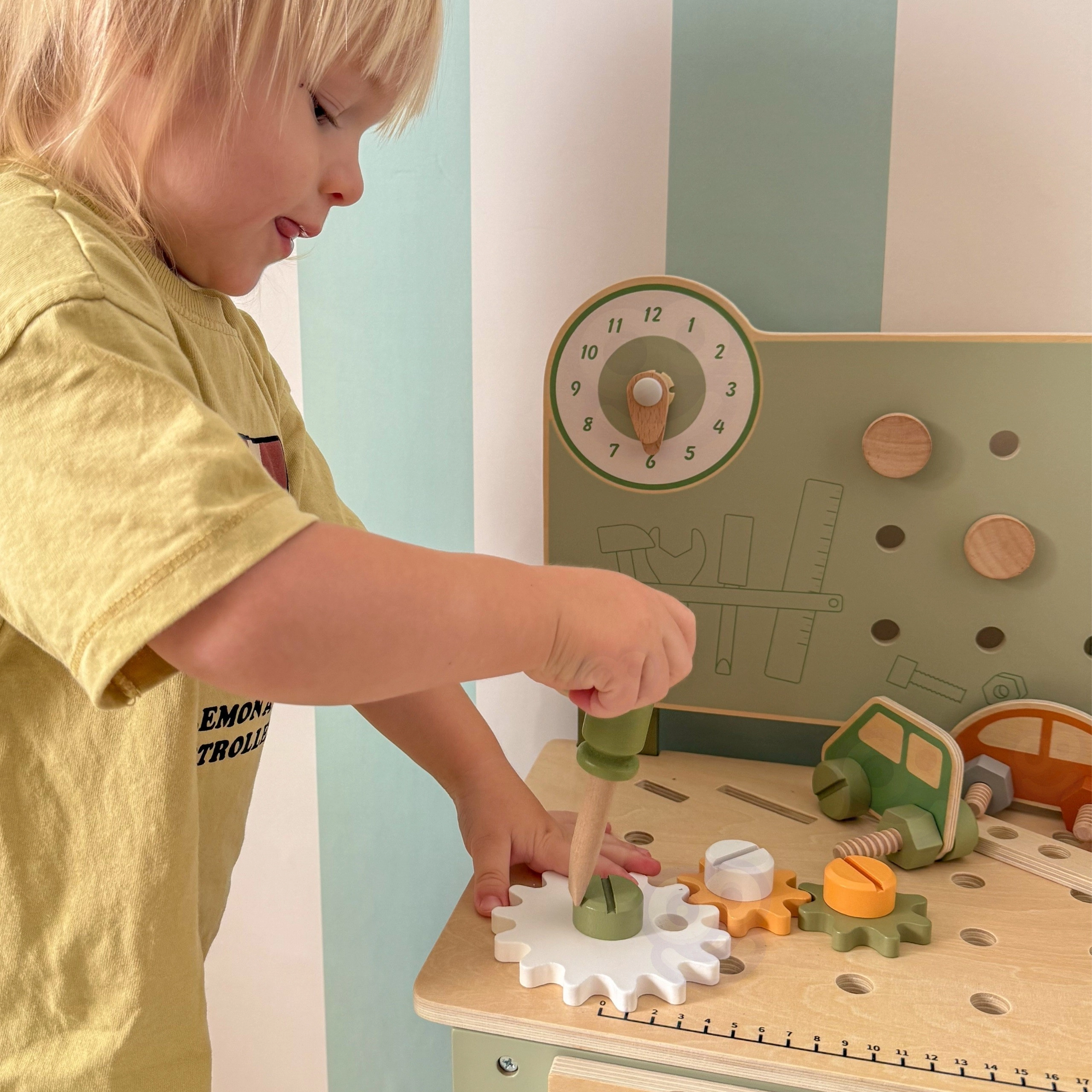 Banca cu pegboard, riglă gradată și elemente rotative susține jocul realist și dezvoltarea abilităților de lucru cu uneltele.