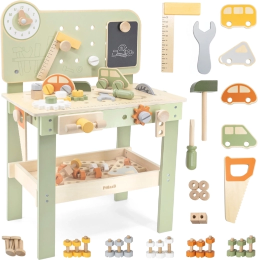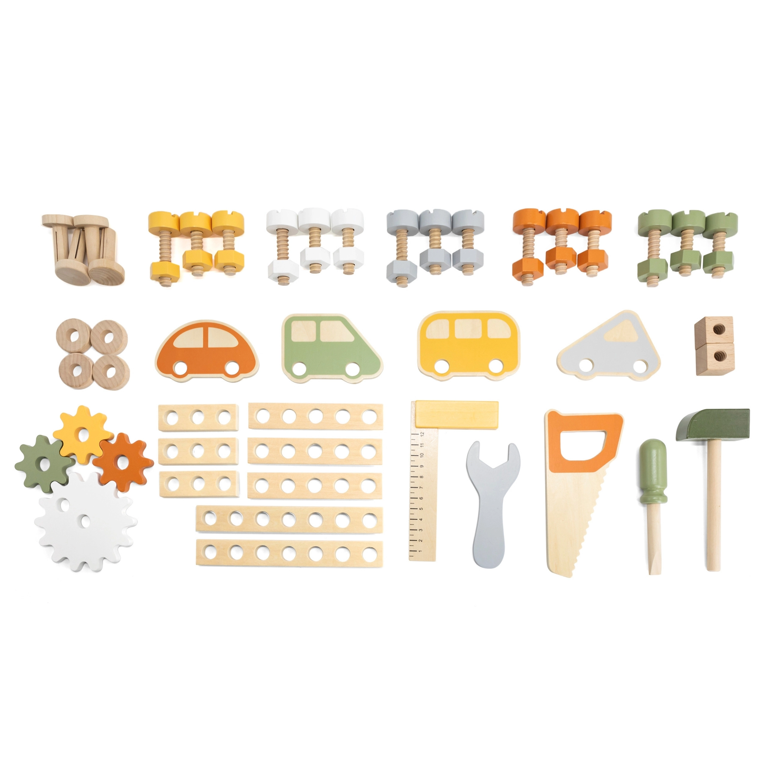 Setul include unelte (ciocănel, cheie, șurubelniță), șuruburi, piulițe, roți dințate, panou cu ceas educativ și o poliță practică pentru depozitare. Copiii pot asambla propriile creații, „repara” și sorta piesele – ideal pentru dezvoltarea creativității, răbdării și planificării.
