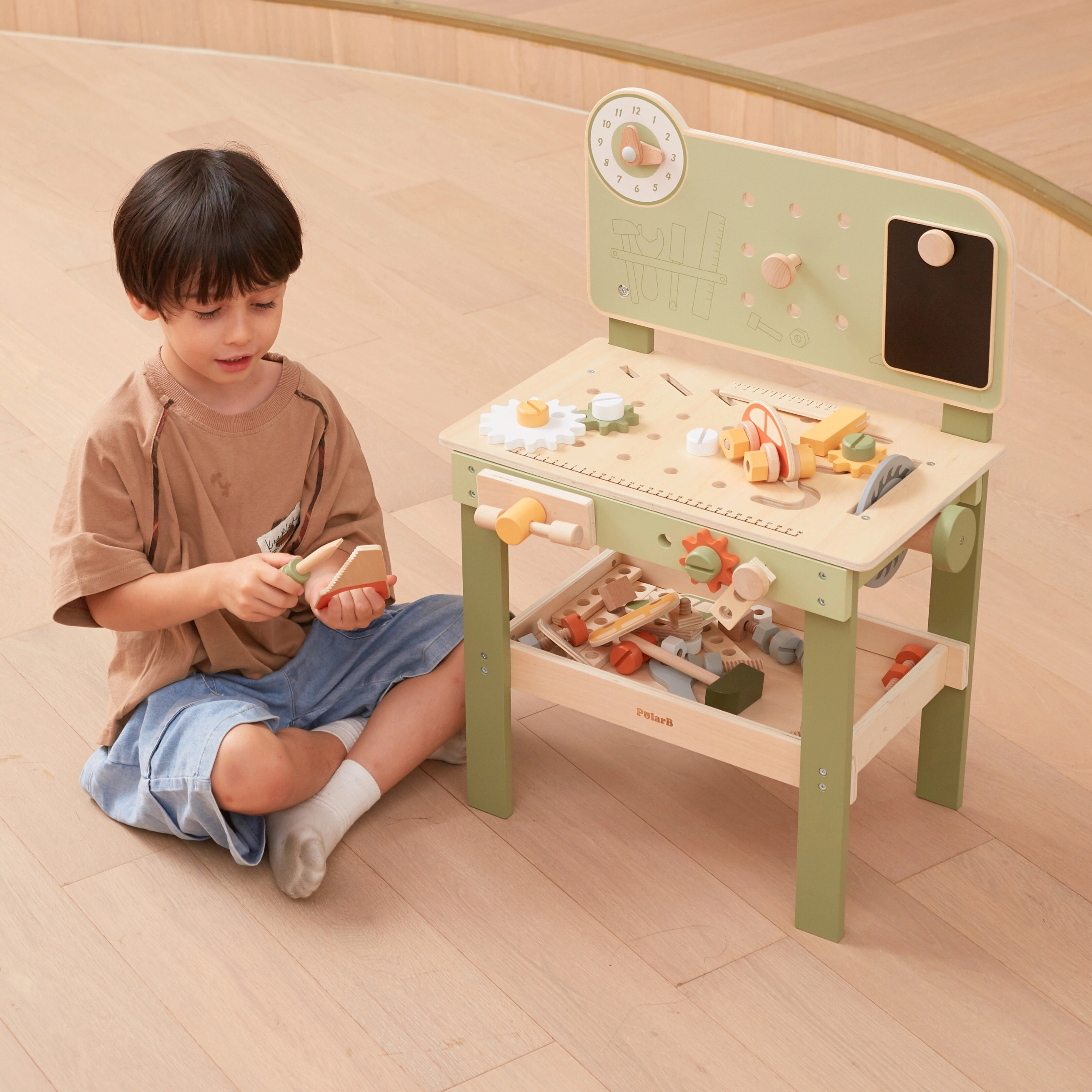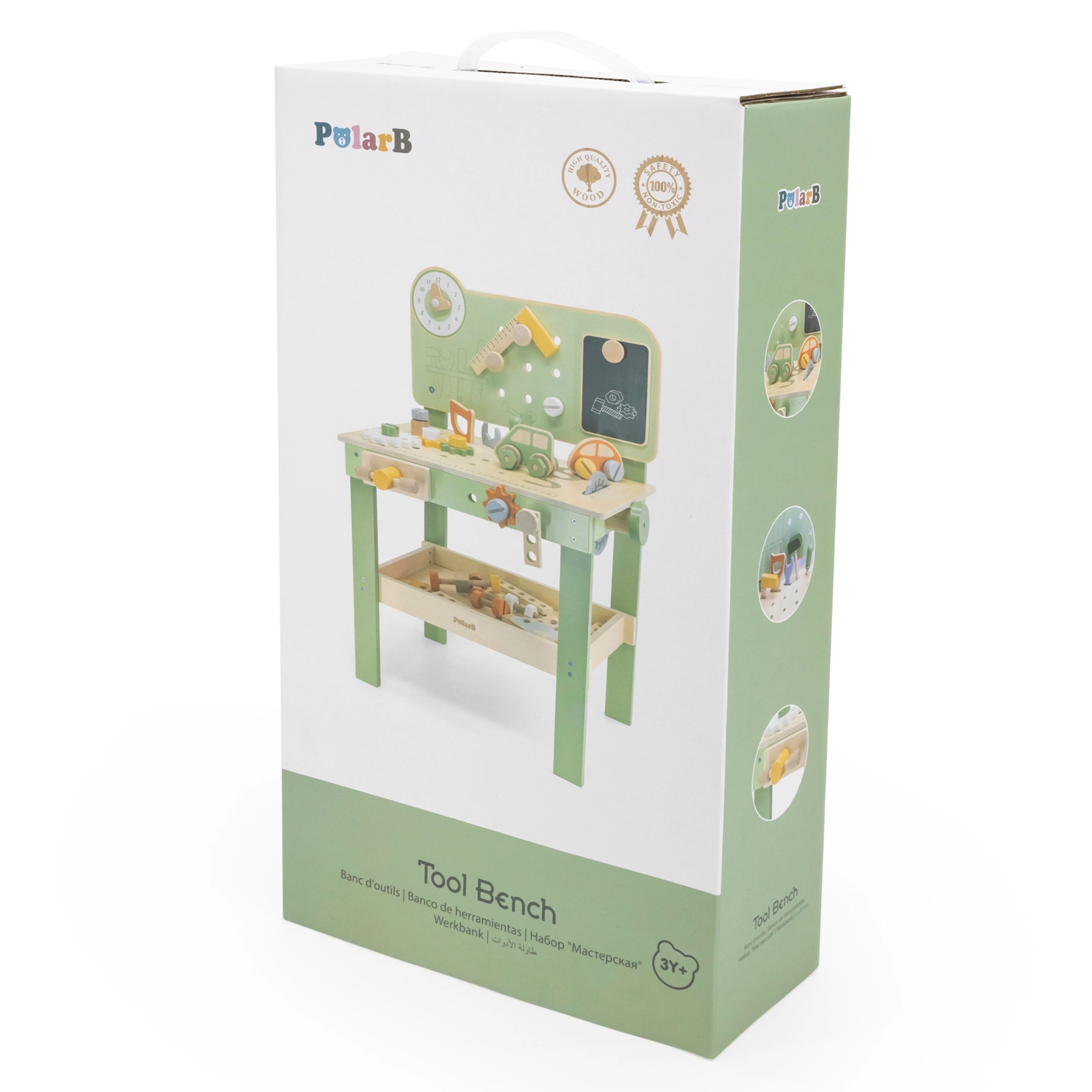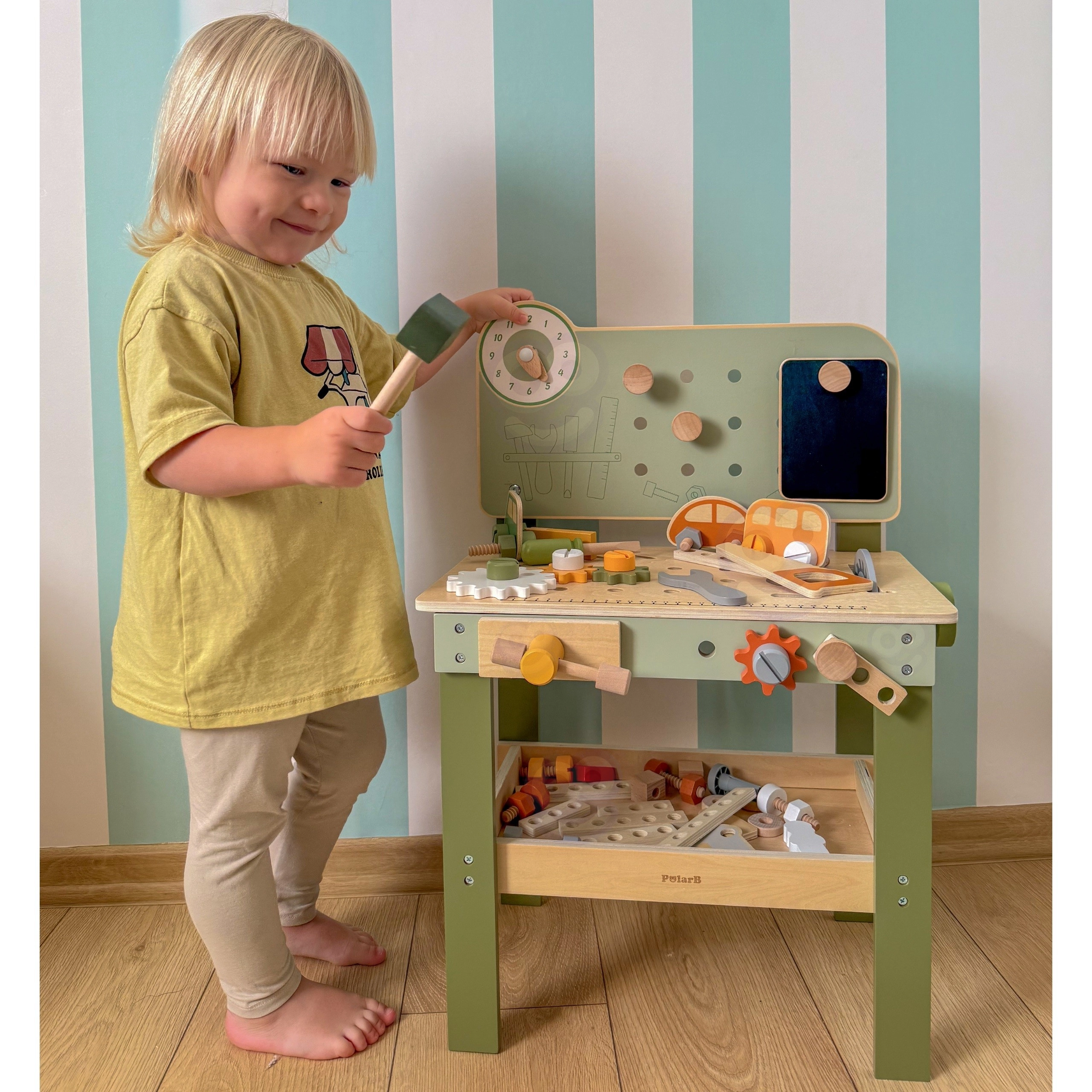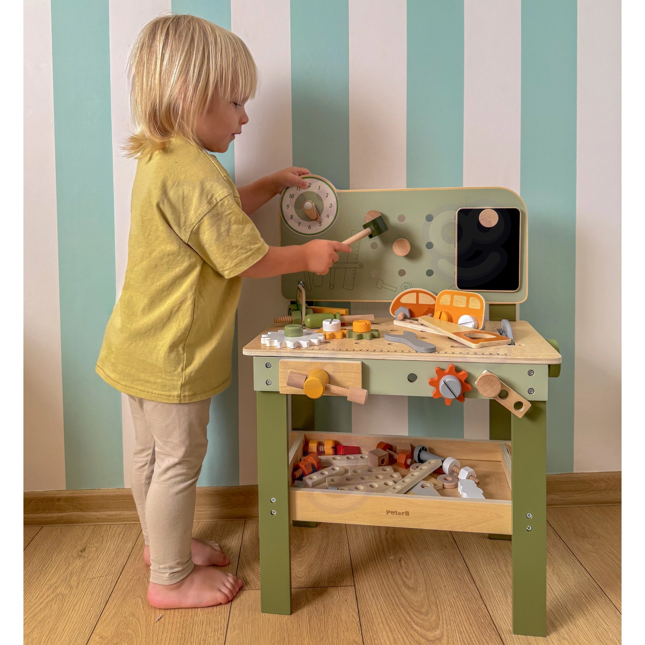 Descoperiți banca robustă și stilată Viga PolarB, concepută pentru micii meșteri de la 3 ani. Datorită construcției din lemn, roților dințate care se învârt lin și accesoriilor bogate, copiii își antrenează coordonarea mână–ochi și învață să rezolve sarcini prin joacă. Materialele sigure și detaliile bine gândite garantează durabilitate îndelungată și depozitarea comodă a componentelor.