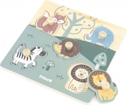 Puzzle-urile din lemn PolarB îmbină materialele de calitate cu un design bine gândit pentru micii exploratori. Fiecare piesă are un mâner din lemn pentru o prindere ușoară de către degețelele mici și o așezare precisă în decupajul corespunzător. Sub fiecare formă este desenată o imagine a animăluțului pe placă, care îi ghidează pe copii și îi motivează să continue să asambleze.