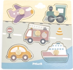 Puzzle din lemn cu motivul mijloacelor de transport. Dimensiunea plăcii din lemn aprox. 22 x 22 cm. Dimensiunea ambalajului aprox. 22 x 22 x 2,5 cm. Vârsta 18m+