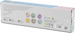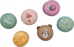 Setul conține șase macarons în culori diferite și cu motive jucăușe (inimioare, fructe, animăluțe) care stimulează imaginația și jocul tematic.