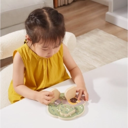 Datorită lemnului de calitate și finisajului neted, jocul este sigur pentru mânuțele mici. Ilustrațiile colorate motivează la joacă repetată și ajută la recunoașterea culorilor și formelor. O alegere excelentă pentru prima jucărie educativă din camera copilului.
