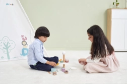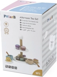 Setul de ceai din lemn este ideal pentru primele jocuri sociale ale copiilor. Suportul pe două niveluri cu deserturi, două farfurii, două ceșcuțe și lingurițe creează scena perfectă pentru ceaiul de după-amiază sau o masă festivă. Datorită realizării atente din lemn durabil, jucăria este plăcută la atingere și sigură pentru mâinile mici.