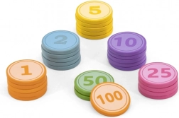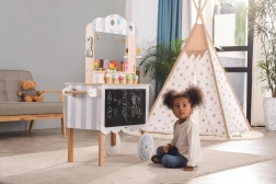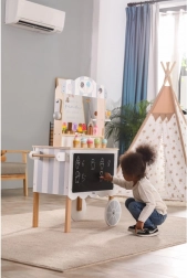 Această set de stand din lemn funcționează ca un punct de vânzare, cofetărie sau tarabă de înghețată. Copiii își pot juca scenariul preferat datorită multiplelor accesorii precum acadele, înghețate, vafe și topping-uri. O componentă excelentă este tabla pentru a scrie sau desena meniul zilei. Întregul set este vopsit cu culori netoxice în culori delicate, care atrag atenția copiilor.