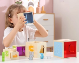 Acest set uimitor conține șase blocuri de dimensiuni diferite, fiecare având motivele sale specifice. Copiii învață astfel să deosebească numerele, formele, culorile, dimensiunile și animalele. Blocurile se pot introduce unul în altul cu ușurință sau se pot stivui, ajutând copiii să înțeleagă conceptul de organizare și ordine.