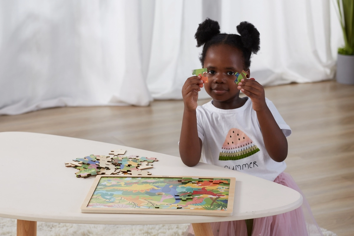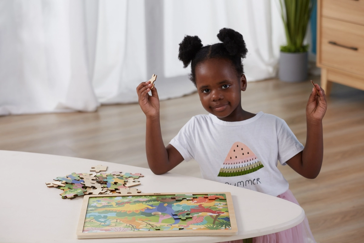 Tăvița solidă din lemn menține piesele la locul lor, ușurează transportul și depozitarea și îi ajută pe copii să se concentreze la asamblarea imaginii.