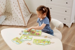 Pachetul conține 20 de piese din lemn, 3 șnururi și 10 modele. Copiii pot urma cardurile cu modele sau pot crea propriile imagini.