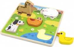 Acest puzzle simpatic din lemn cu tematică de fermă include 5 piese robuste – căluț, oiță, găinușă, cățel și rățușcă. Copiii introduc animăluțele în decupajele corespunzătoare de pe suportul colorat, exersând recunoașterea formelor și memoria vizuală.