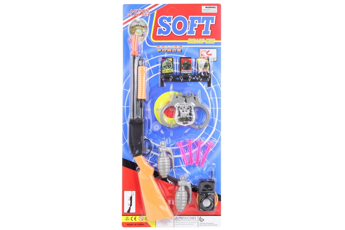 Acest set de acțiune îi va încânta pe toți micii pasionați de jocuri pline de aventură. Componenta principală este o pușcă din plastic cu armare, care trage săgeți cu ventuze – acestea aderă în siguranță pe suprafețe netede. În pachet găsiți, de asemenea, grenade, stație radio, cătușe, insignă și o țintă pentru antrenarea preciziei.