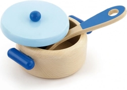 Echipare completă pentru joaca de-a gătitul: oală cu capac, tigaie cu ou, lingură, solniță, piperar și mănușă textilă. Ideal pentru primele aventuri în bucătărie.