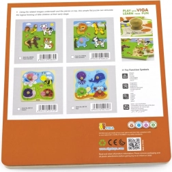 Puzzle-ul cu inserții are o placă de bază cu dimensiunile 22,5 x 22,5 cm și o grosime de 1 cm. Designul vesel și colorat va cuceri orice mic explorator și va aduce multă distracție.