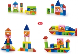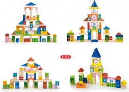 Setul cuprinde cuburi de diferite mărimi, de la 2,5 cm la 7,5 cm, permițând copiilor să creeze diverse construcții precum case, poduri și alte elemente urbane. Datorită materialului din lemn rezistent, cuburile sunt potrivite pentru jocuri de lungă durată și sigure.